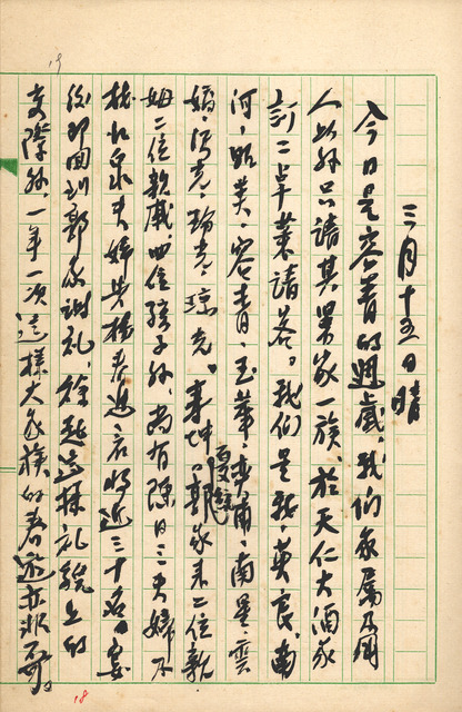 此係吳新榮寫於1967年3月15日日記,當日孫女容青週歲,親族、摯友們一起在天仁大酒家聚餐慶祝。   吳新榮次子南河與郭昭美於1964年4月4日完婚,1966年3月17日長女容青出生,當日滿一歲,吳、郭兩家訂桌宴客。吳新榮在這一天的日記最未寫道:「未來一年一次這樣大家族的春遊亦非不可。」然而,不幸於3月27日台北旅次中,心肌梗塞過世。   《吳新榮日記》寫自1933年至1967年,中間的1934年和1954年佚失。吳新榮日記撰寫年份長,從戰前跨越戰後,如同吳新榮所述:「日記可作為生命之記錄,生活之反省」,因此從他的日記中可以看見公、私領域不同面向的記事,個人的想法與情感皆流露於其中,特別是從他的文學活動和人際交友中,可以看見一位文人醫師跨足不同領域的公共參與和社會實踐。吳新榮於1950年發現羅患高血壓,後又有幾次因心臟不適入住台大醫院。1967年3月15日之日記是為吳新榮最後一篇日記。