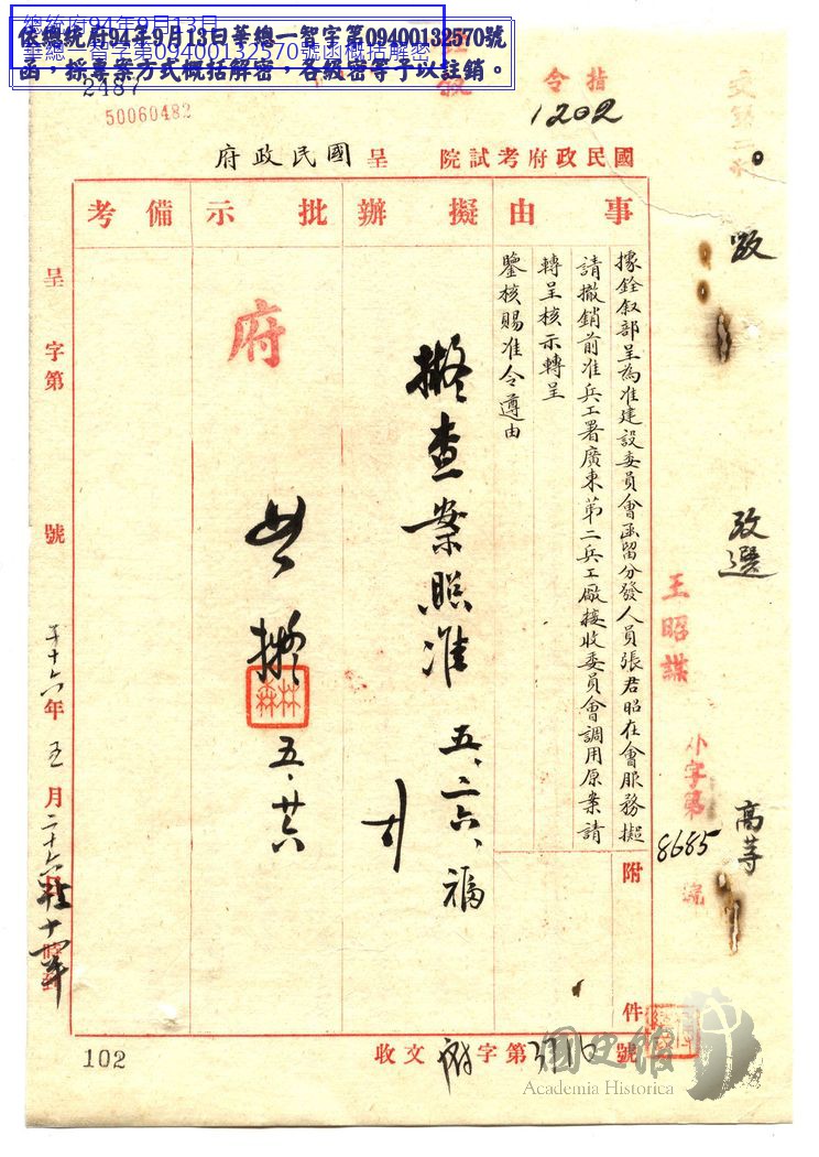 考試院長戴傳賢呈國民政府為銓敘部呈為准建設委員會函留分發人員張君昭在會服務擬請撤銷前准兵工署廣東第二兵工廠接收委員會調用原案